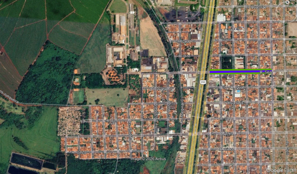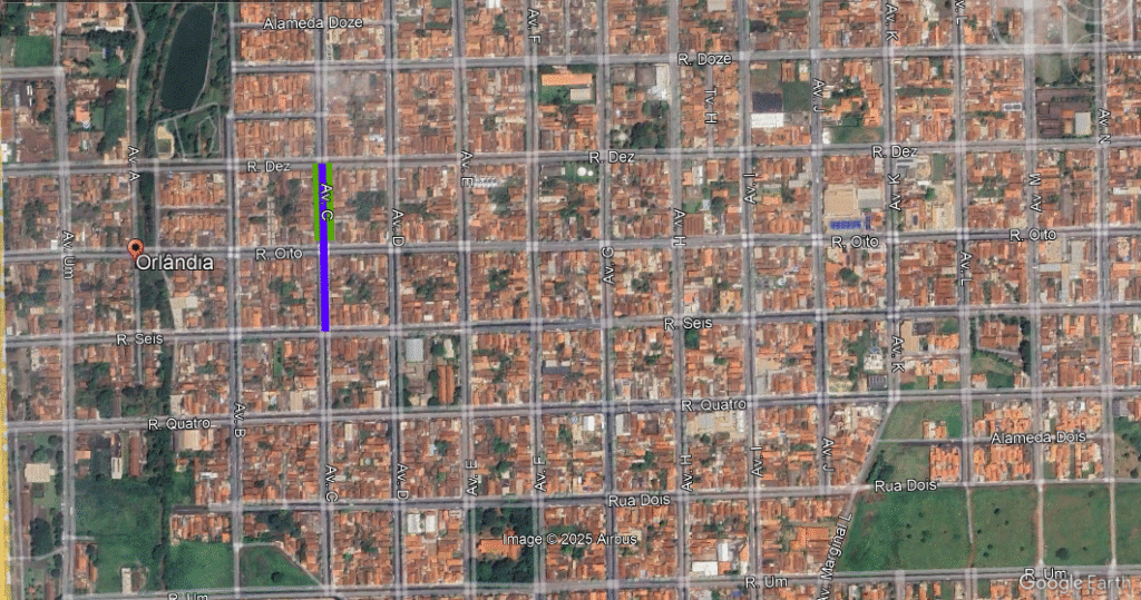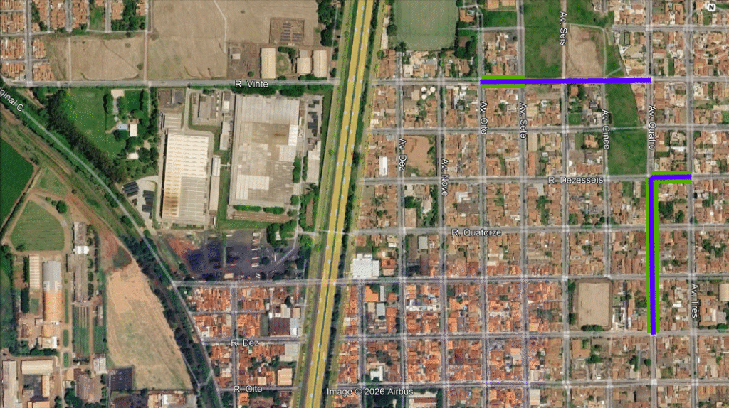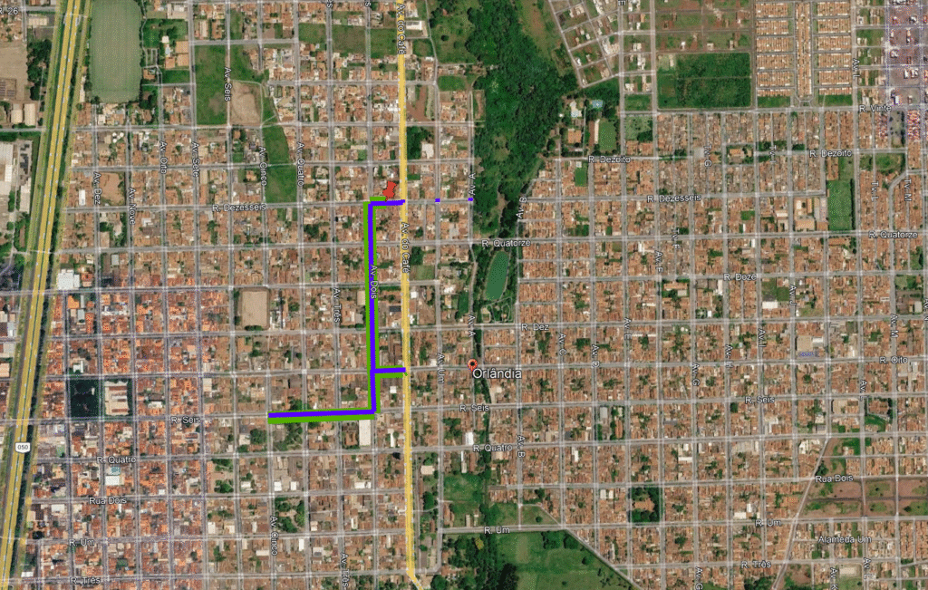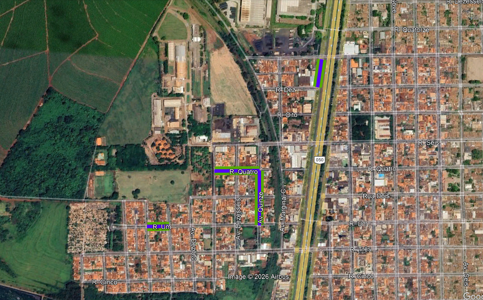 Linha Azul Extensão total onde a nova rede será implantada. Linha Verde Trechos onde a obra já foi executada e aguarda a repavimentação ou a recomposição de grama do canteiro central. Pins Vermelhos Indicam os locais onde as equipes estão trabalhando no momento.